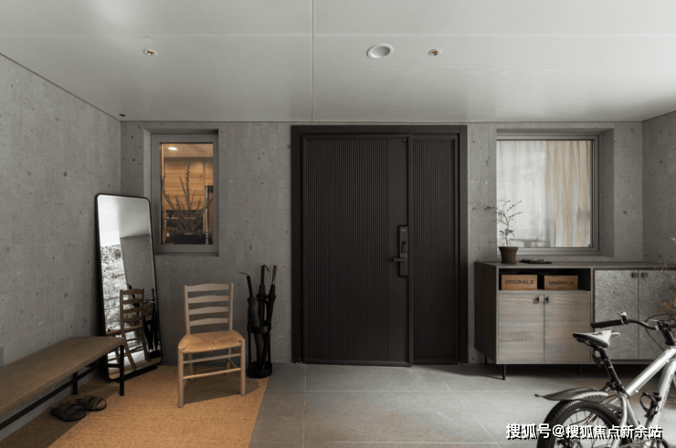 这个户型很罕见地在入户空间,预留了休息会客区域,这里作为舒适的多功能区域与室内室外都能衔接呼应。