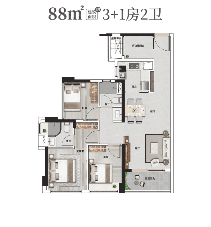 • 88㎡:竖厅与横厅双选择,主卧套房设计,南北通透,总价360万起。