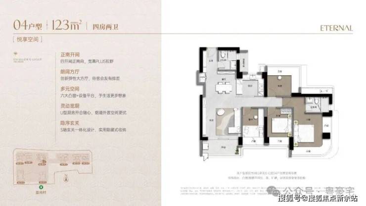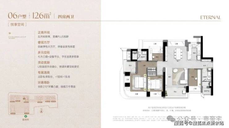 173m²的4房2厅3卫+家政间,设计的是竖厅类双龙抱珠格局,独立电梯厅入户约8.13㎡,客厅5.55米开间,LDKB一体化设计,主卧套房270°环幕凸窗+私享阳台,八大凸窗+设备平台+家政间,分别做到了主卧27.1㎡/次卧14.87㎡/次卧12.38㎡/次卧8.38㎡/家政间2.93㎡+阳台1.38㎡(实测面积,去掉墙体),U型厨房,公卫三段式干湿分离,得房率超90%(包含赠送),阳台9.56㎡正北朝向,看会展中心+市民广场。