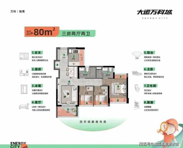 80平三房两卫,市面上最高的约94-98%可使用率,可以与其他89-95的户型套内面积媲美,10.85-12.9米的南向面宽,户型方正实用。