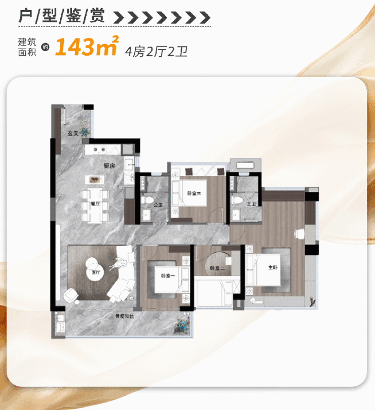 建面约130㎡四房,是项目首推户型中门槛相对较低的入门级产品,适合三代同堂家庭。