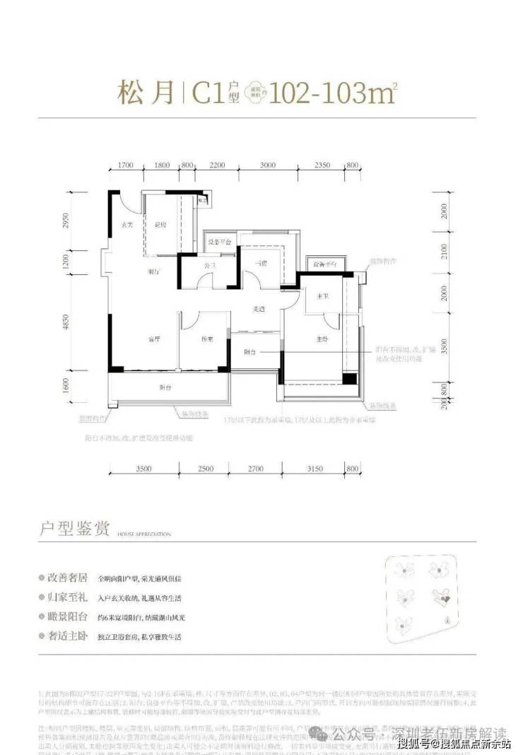 102-103㎡的4房2厅2卫(C1-C2户型),设计的是经典竖厅格局,进门入户玄关,客厅3.5米开间,LDKB一体化,S墙设计预留冰箱卡槽位,动静分区,四开间朝南,4个卧室分别做到了主卧17.98㎡/次卧8.37㎡/次卧8.1m²/次卧7.75㎡(包含墙体飘窗),L型厨房,公卫干湿分离带1个约2m²的设备平台,得房率约81%(不含赠送),客厅连接次卧出9.6m²的观景大阳台,东南或西南朝向。套内面积83.43m²+赠送面积23.86m²=实际使用面积107.29m²,加上赠送后得房率约104.16%。
