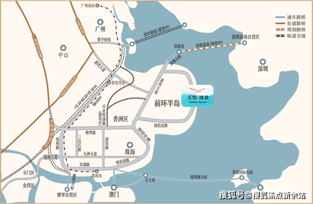 天恒湾景,坐落于唐家湾,地理位置得天独厚,占定三大自贸区几何中心(深圳前海自贸区、广州南沙自贸区、珠海横琴自贸区)。且以大桥未支点效应,多维交通路网向外延展:港珠澳大桥、深中大桥(建设中,预计2024年通车)、金琴快线、兴业快线(建设中)、唐家港码头(计划开通到蛇口新航线)、广州地铁18号线延长线(规划中),未来将形成大湾区一小时生活圈,接轨世界前沿。