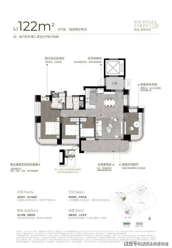 湾啟紫荆位于前海妈湾听海大道,占地约1.5万㎡,住宅建面约6.6万㎡,容积率5.14,共有三栋住宅组成,层高36-37F,共485户,车位595个,车位比1.1.2,4梯5户,主推约96㎡稀缺三房、111㎡3+1房、122㎡四房、142㎡四房。户型设计了大客厅、宽景阳台、阔景飘窗等,拥有山海河多重景观资源,计划品质精装交付。户型采用建筑新规设计,户户大阳台,4梯5户,分布式电梯设计,独立电梯厅。