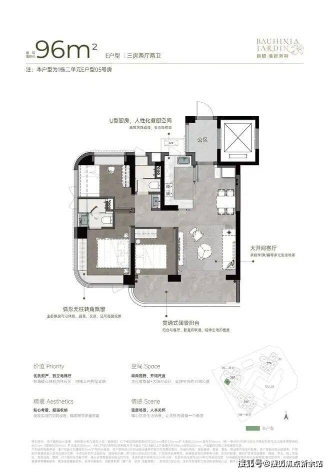 从空间布局来看,U 型厨房的设计极为人性化,大开间客厅与宽阳台是整个户型的最大亮点,西南向视野使得整个户型采光充足,贯通式阔景阳台与客厅、卧室双通,极大地拓展了生活空间的宽度。主卧的飘窗台也是一大亮点,弧形无柱转角飘窗不仅提供了广阔的视野,还增加了室内的采光。