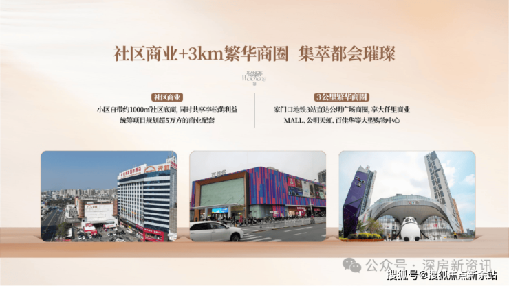 项目自身配建约 1000㎡沿街商业,周边 3 公里范围内覆盖宏发大仟里(公明最大购物中心)、天虹商场、百佳华商场等成熟商业体,满足日常购物需求。
