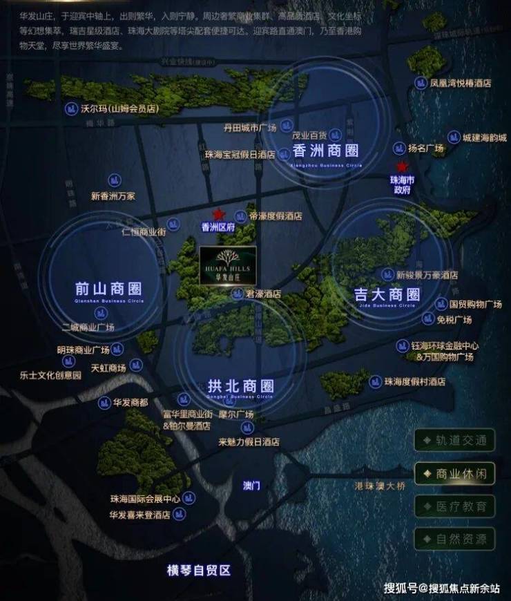 华发山庄周边全维高阶顶配配套悉数实景落地,教育临近香洲区优质公立名校资源,全龄段高端教育一站式配齐;周边富华里、玖洲道、华发商都等高端商业集群环伺,高端商务社交、品质消费休闲随心满足;生态毗邻板樟山森林公园与柠溪市政公园,康养休闲资源得天独厚;医疗环绕珠海市香洲区人民医院等三甲资源,全方位适配高净值家庭自住康养、商务社交高阶生活需求。