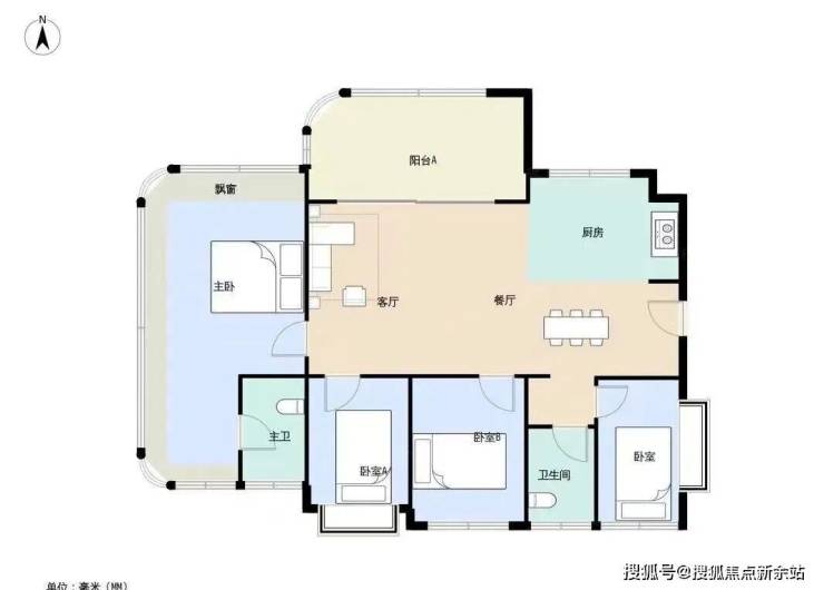东南向横厅,无过道浪费,主卧弧形飘窗。