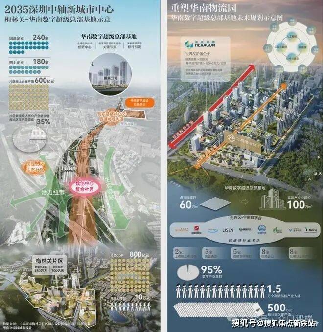 华南数字超级总部基地,湾区高密度数字集群,对标深超总、腾讯企鹅岛及香蜜湖国际金融中心,四大微城市之一,产学研商住定位,世界500强海克斯康已落户,已集聚35+龙头名企,打造湾区数智产业集群,数字产业集群度达95%,驱动板块加速蜕变。