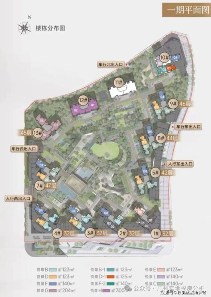 一期:住宅总占地约5.6万㎡,总建面约38.1万㎡,一共12栋楼,住宅约1595户,采用围合式布局,内外双园林。