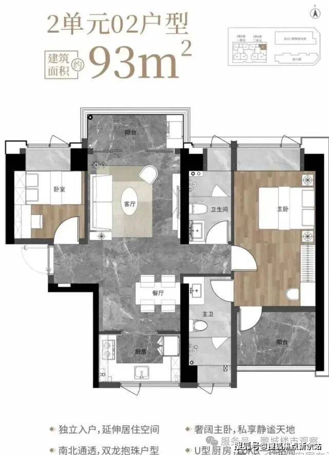 93㎡的3房2厅2卫,1栋2单元02户型,设计的是竖厅南北通透格局,独立入户,客厅3.6米开间,客餐厅分离设计,U型厨房,卫生间干湿分离,阳台正北朝向。