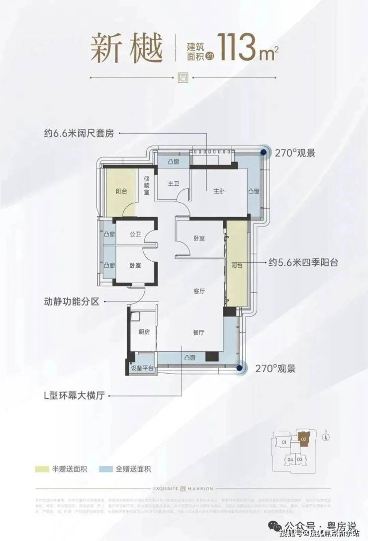 113㎡的4房2厅2卫,设计的是横厅南北通透格局,进门入户玄关,客餐厅一体化设计,餐厅位双飘窗无敌视野,全屋6个飘窗面,客厅连接次卧出5.6米长的巨幕大阳台,L型厨房带1个设备平台,卫生间干湿分离也带1个设备平台,得房率约74.5%(不含赠送),正东朝向。加上赠送约95%得房率。