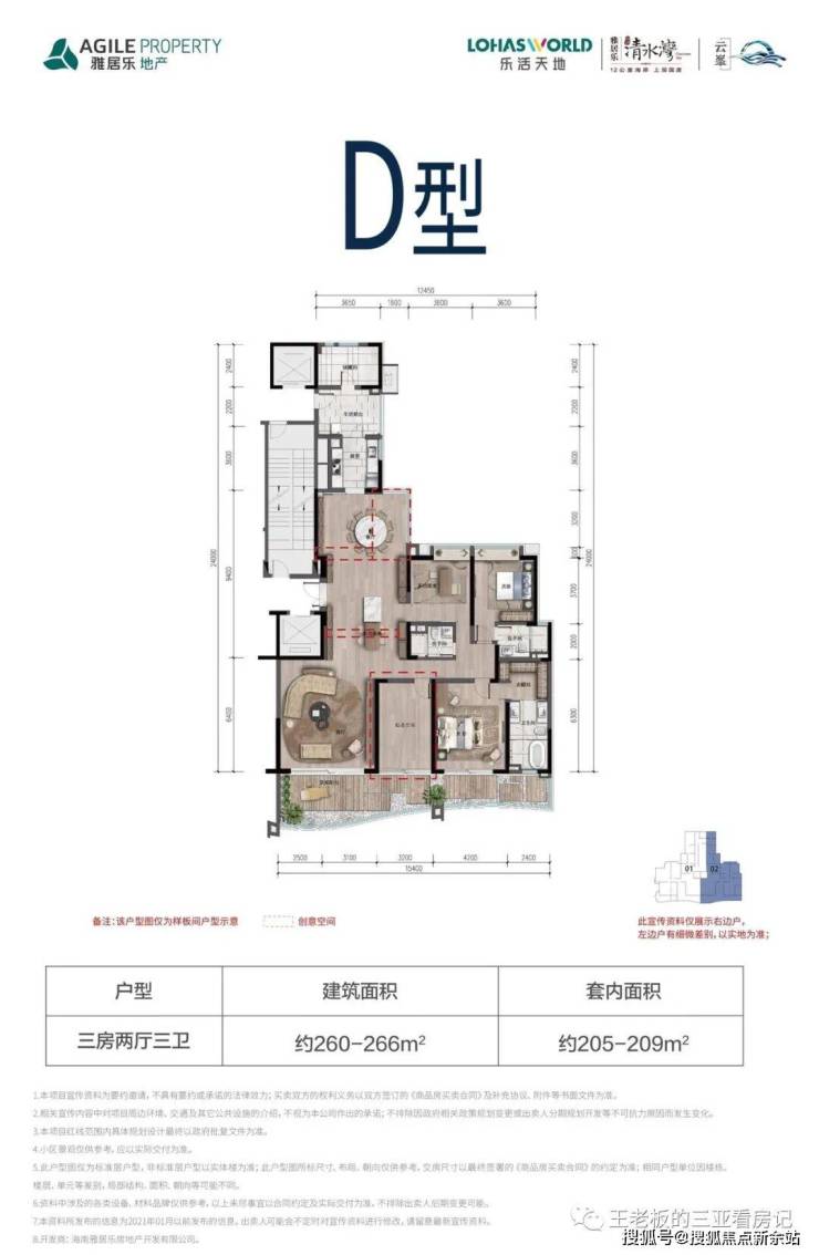————【海境新天·天境】产品户型图————一、D型洋房楼栋号:11#、12#总套数:50套总层数:25层建筑面积约:260-266㎡【推荐理由】:私享蔚蓝海景,奢享百亿醇熟配套临近醇熟商业,繁华体验触手可及功能分区合理,全明通透格局宽幕观景阳台,收藏四季风光盛景舒适主卧空间,纵享度假闲静尊崇