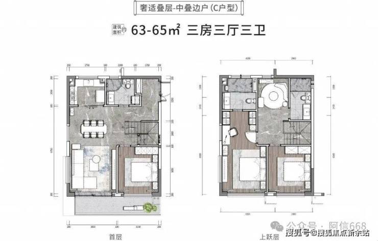 2、中叠边户,63-65平米三房两卫,地上三四层
