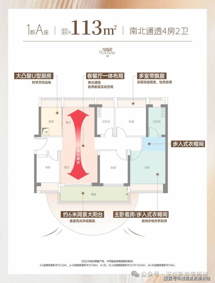 113㎡ 4房2厅2卫竖厅南北对流、餐客分离,主次卧均带飘窗、最大化延伸居住空间,超大阳台拥有更佳的采光和景观视野。