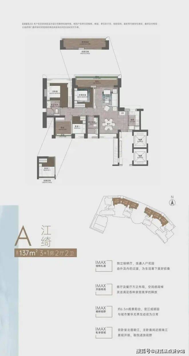 低区以朝向为主导,布置140m²轻奢产品;高区以景观为主导,布置190~250m²豪宅产品;拥有一线江景资源的顶层北侧则打造350~420m²奢华大平层户型。