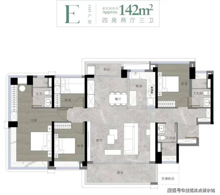 79平也是南向,其中改善108-128-142都是三梯四户的超高层楼栋,新规户型使用率超100%,全南向优景,户户都有大阳台,而且每一户的主卧室都是240度的窗景,这一点,确实蛮牛的。