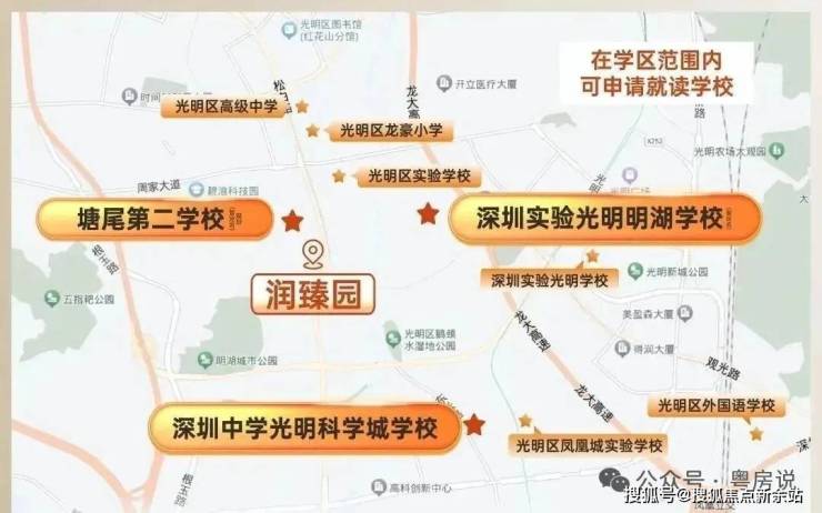 项目自带有1所9班制幼儿园,家门口约100米有1所九年制公办学校在建,另外根据光明区教育局2024年最新的学区划分,润臻园属于塘尾社区,小学学区划分在光明区外国语学校、凤凰城实验学校、光明区实验学校、玉塘学校、龙豪小学;初中学区划分在深圳中学光明科学城学校二部、光明高级中学、深圳实验光明学校。