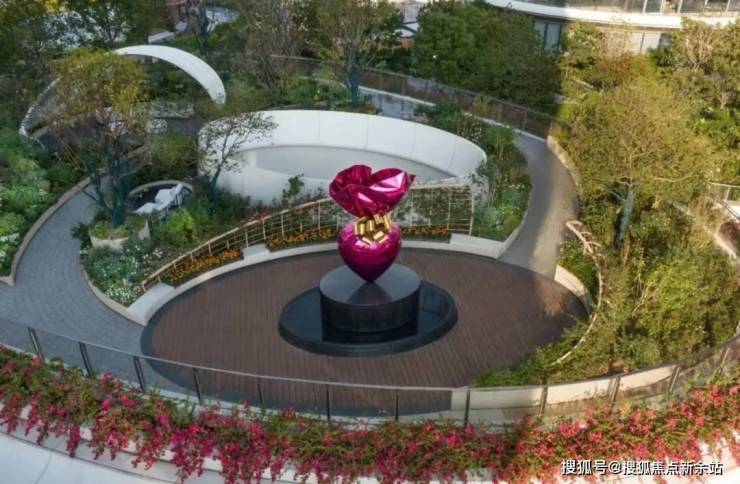 在锦鲤池畔,矗立着项目从佳士得拍卖会上花费6300万拍得的杰夫·昆斯的《圣心》雕塑。