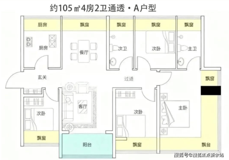 约105-122㎡四房:作为“功能型品质起步”户型,凭借新规下的高实用率(包含赠送得房率约100%)。主卧均带270°环绕式飘窗,户型设计通过飘窗“送了不少面积。