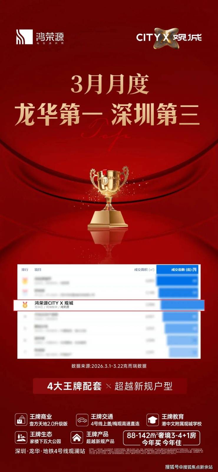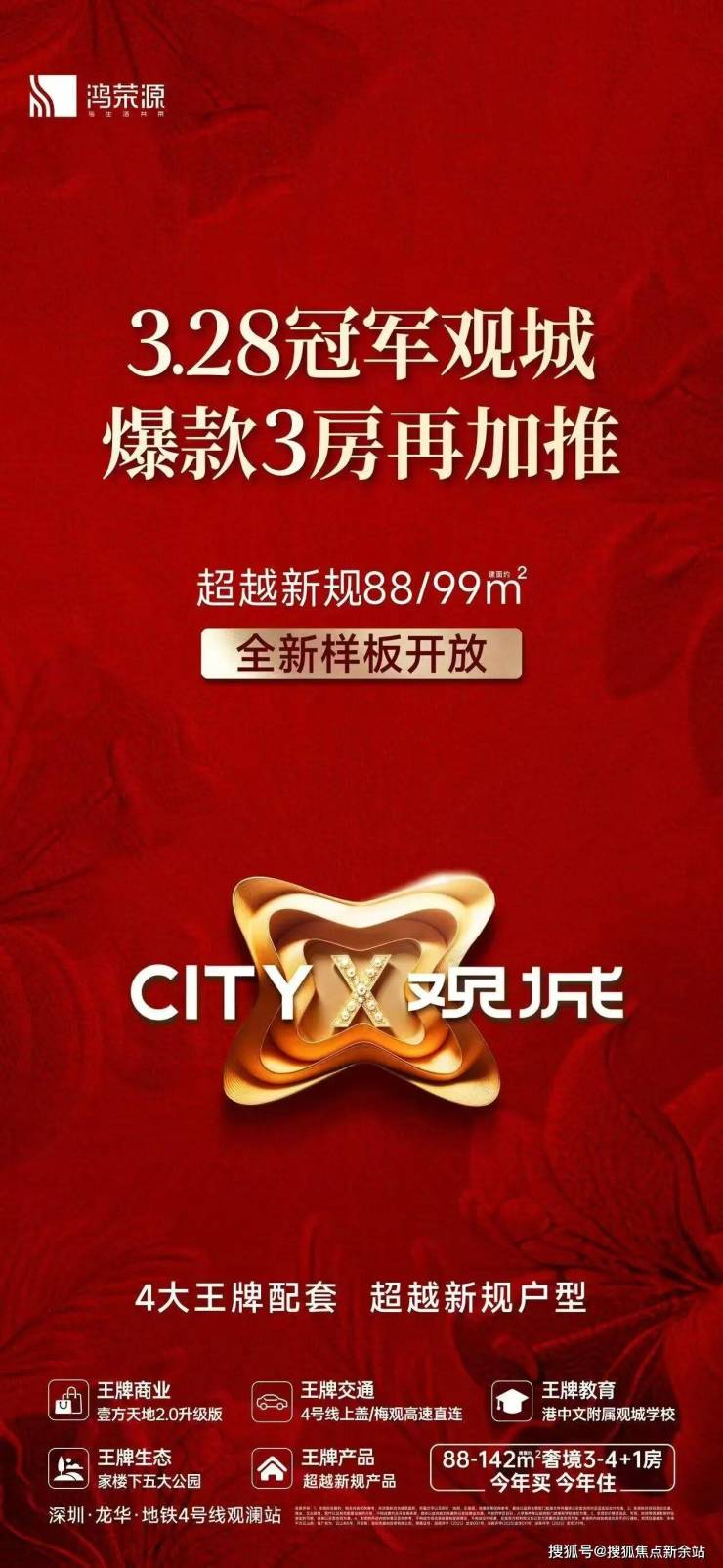 最新消息:龙华观澜超大体量综合体【鸿荣源观城】推出1栋1/2/3单元,3栋1/2单元,共1566套房源,面积有88-98㎡的3房2厅2卫,108-117-143㎡的4房2厅2卫户型,4梯6户设计,本次首推1栋二单元,总共300多套!