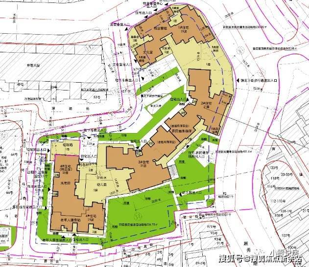 广州城投东园公馆占地面积仅为8470㎡,规划了4栋21-23层住宅,整体容积率高达5.8;其中,南端的4#住宅为回迁房,其余3栋则为商品房,均为塔楼设计。