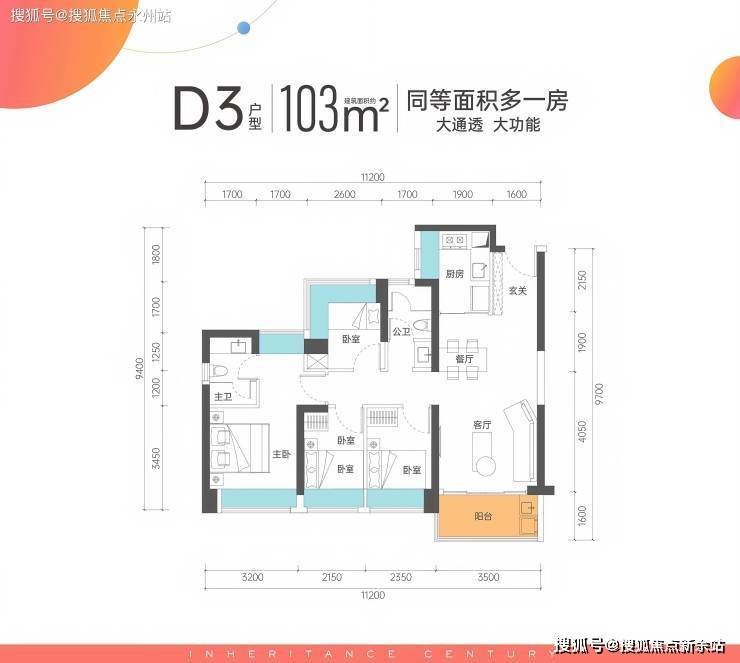 103㎡户型:或为100㎡的变体设计,横厅南北通透,客餐厅开间5.2米,全屋飘窗设计,强调空间灵活性。