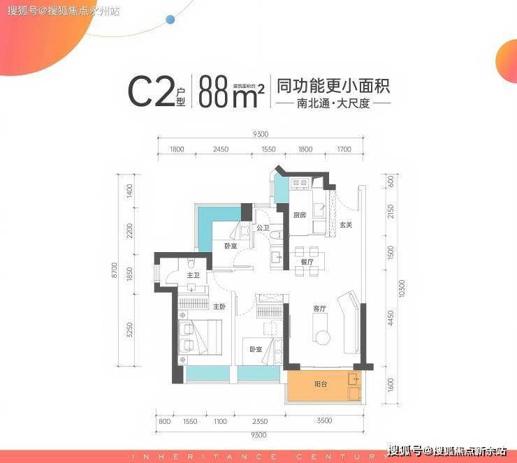 89㎡三房两卫:经典竖厅,三开间朝南,客厅开间3.5米,三分离卫生间设计,功能分区明确。
