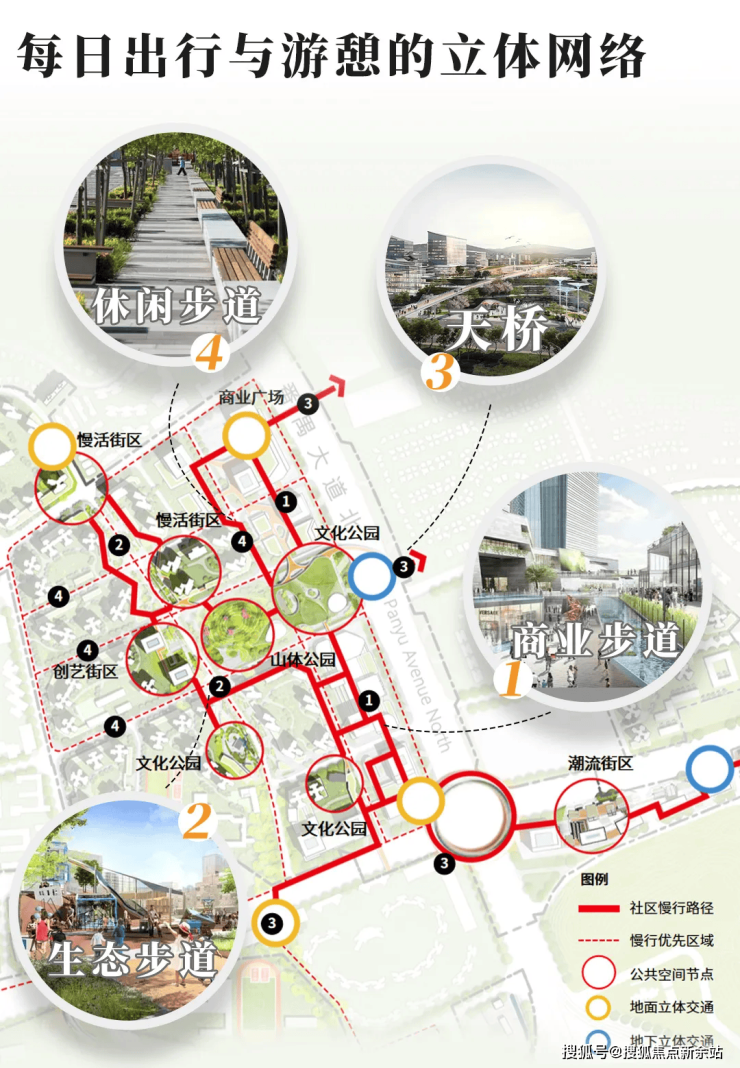 设计立体环廊系统、慢行步道、天桥等,以及开放式的设计,将各个空间节点有机串联起来,丝滑融通👇