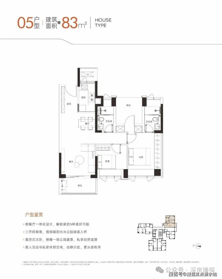 83㎡的3房2厅2卫,设计的是竖厅格局,LDKB一体化,动静分区,三开间朝南,U型厨房,卫生间干湿分离,得房率约94%(包含赠送),东南朝向。
