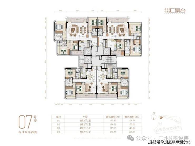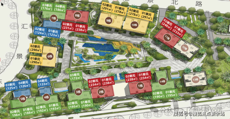 项目由14栋12层小高层组成,产品涵盖123-352㎡三至五房,共8类户型,户型实用率约82-84%