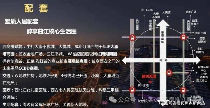 南湖商圈:金地广场、还有超级网红曲江书城和 W 酒店;大雁塔商圈:红遍全国的大唐不夜城、大悦城还有威斯汀酒店等;雁翔路商圈:曲江创意谷、正荣·彩虹谷等;CCBD商圈:金辉·环球广场,华润万象城更多哦未来规划的商务办公配套商业以及项目自身配套商业,多种繁华商业配套受都市生活,满足日常所需。