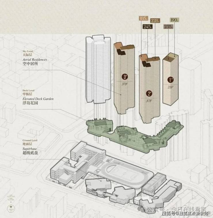 项目以 “浮岛社区” 理念精心打造,采用 “浮岛甲板” 设计策略,四栋住宅坐落于抬升的绿化甲板之上,形成 “超级社区底盘 + 浮岛绿化甲板” 的垂直共生模式 。通过 “仪式水轴 - 艺术庭院 - 空中浮岛森林” 三级景观系统,打造出一个充满诗意的 “垂直森林社区”,让建筑与自然完美融合,仿佛将家安在了公园里,推窗见绿,出门入园 。