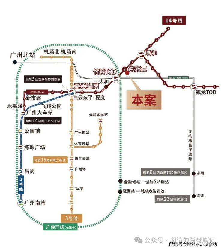 🚞三轨交汇利好即将兑现。而14号线二期(预计2023年开通)可直达广州火车站,新白广城轨、广佛环线预计2023年底开通,5站白云新城,6站天河,纵享高效通勤。钟落潭三轨交汇即将兑现。