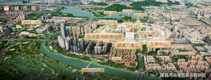 项目规划计容建面积超50万㎡,定位为华润置地在顺德复刻“深圳片区统筹(南山模式)”的城市综合体项目范本,北侧为别墅大平层豪宅区,南侧是省一级顺峰名校,以及顺峰山公园、桂畔湖;东侧是云近滨河公园,西侧是成熟商圈,可谓是“出则繁华,入则宁静”。