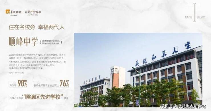 小区门口一路之隔即省一级公办名校顺峰幼儿园,顺峰小学和顺峰初级中学,附近还有大良实验小学,顺德本真未来小学,李兆基中学等;满足孩子3到18岁的全龄段优质教育。地铁一站即可到达顺德第一中学。