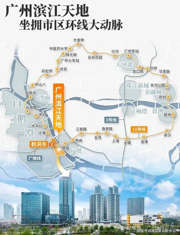 项目紧邻地铁 11 号线鹤洞东站,直线距离不足 200 米,出行便捷高效;规划中的佛山地铁 11 号线亦紧邻项目南侧设站,未来将实现广佛轨道无缝衔接,进一步拓宽出行维度。作为广州首条环线,地铁 11 号线可快速连通珠金琶 CBD 核心区域,同时可便捷抵达大湾区艺术中心、老西关永庆坊等人文地标,让商务通勤与人文休闲高效切换,轻松邂逅艺术灵感、感受百年西关烟火气。
