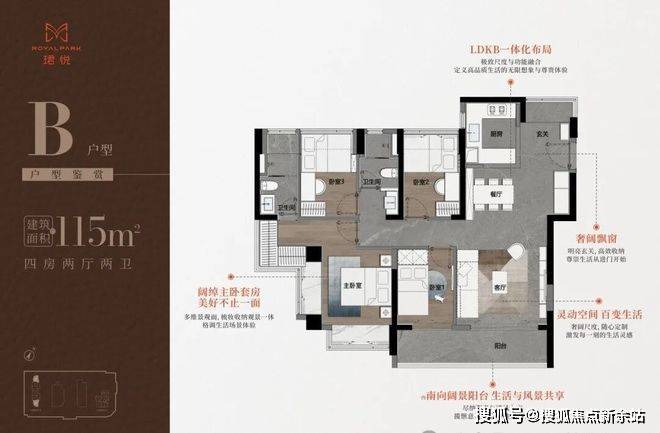 115㎡的4房2厅2卫,B户型(2栋1单元01/06户型),设计的是竖厅格局,进门入户玄关,LDKB一体化布局,三开间朝南,动静分区,客厅连接次卧出阔景大阳台,U型厨房,公卫三段式分离,西南朝向,靓点是端头位可以做到南北通透。