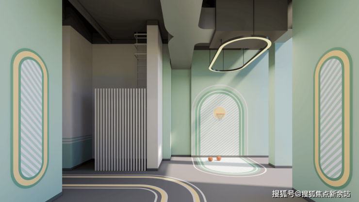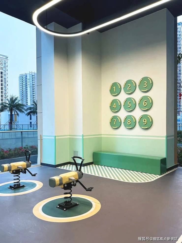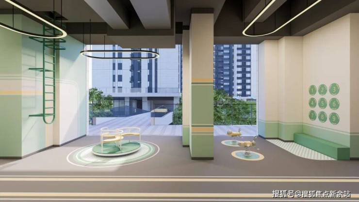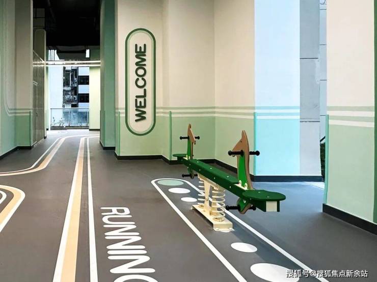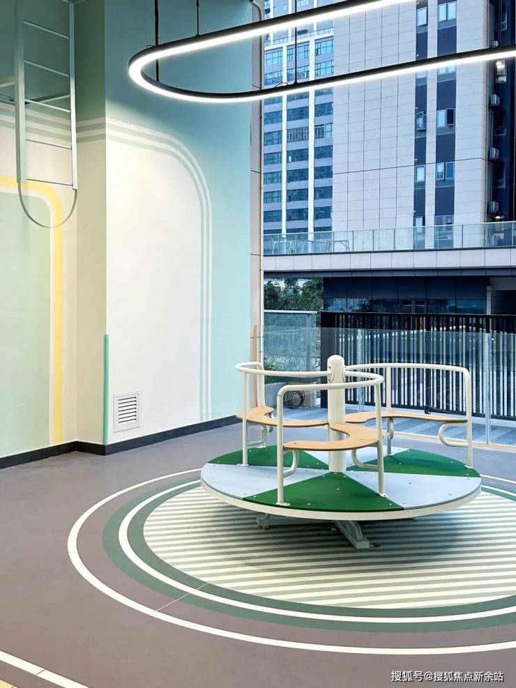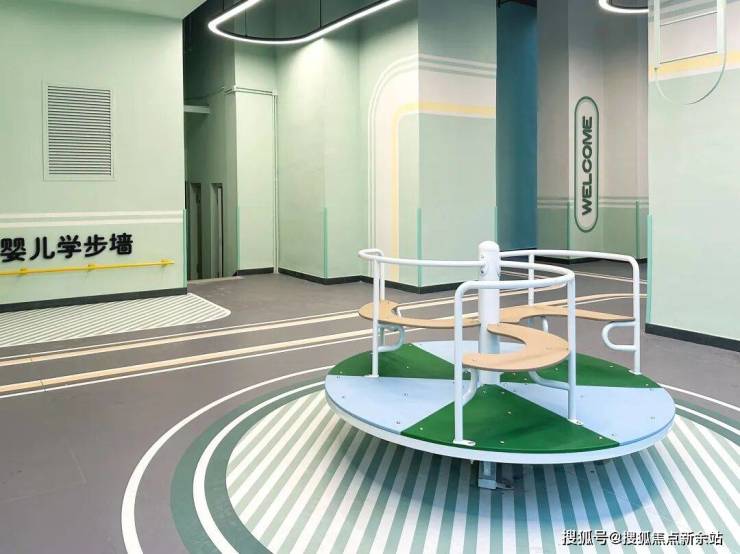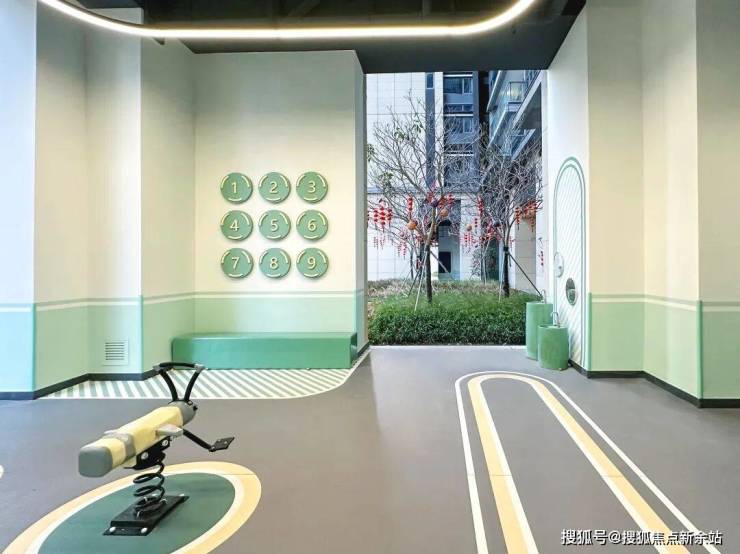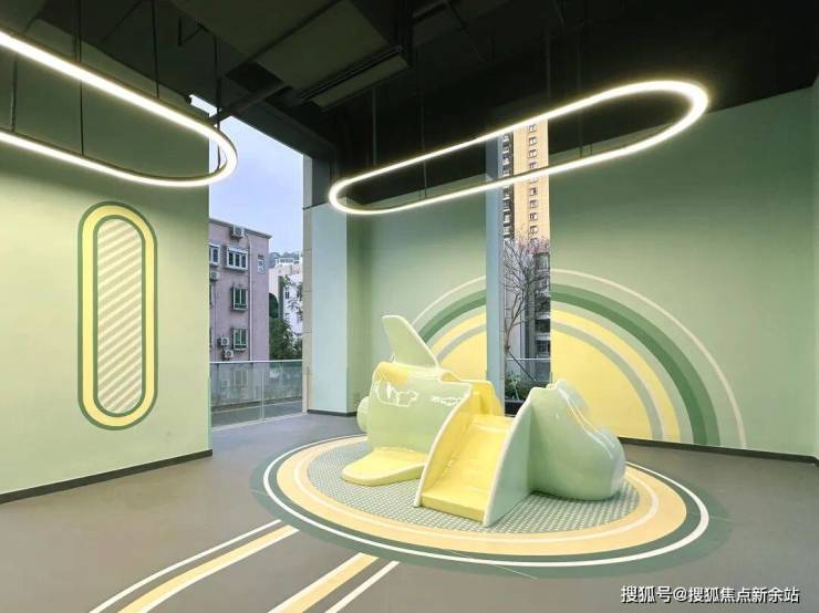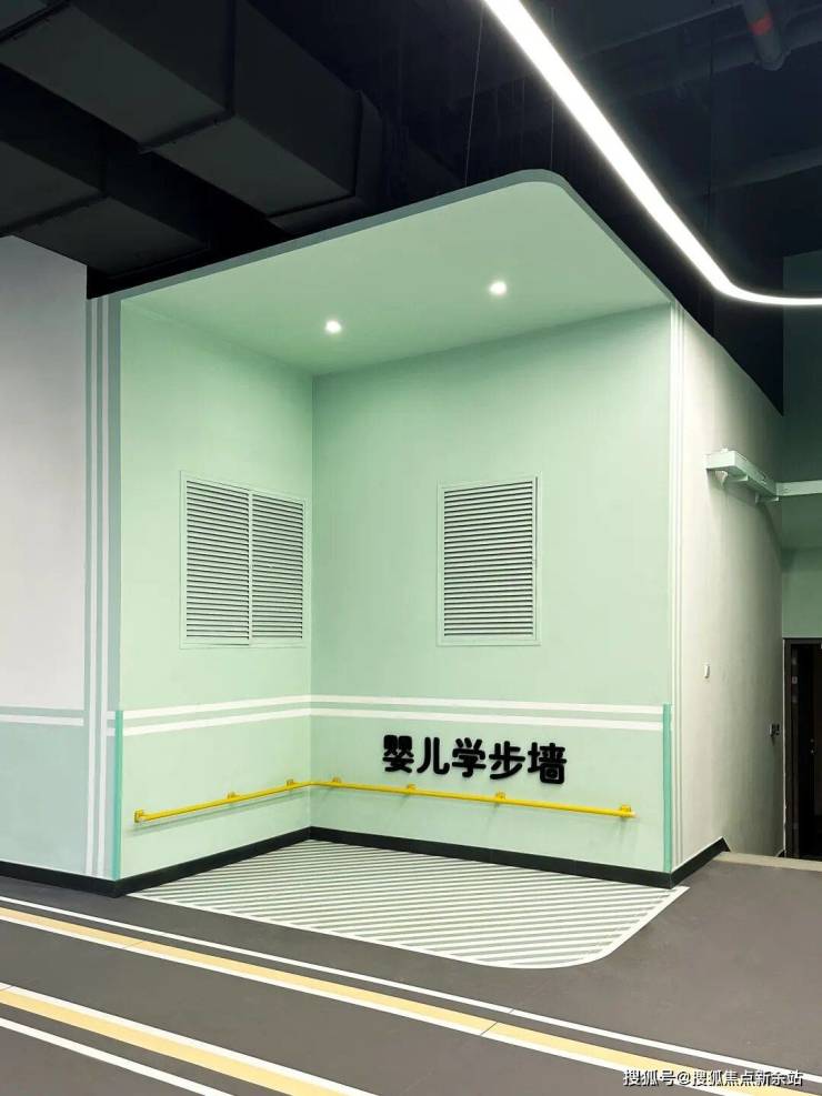 还有一个艺术与趣味融合的“童趣乐园”,薄荷绿墙面环抱投篮区,绿白轨迹引导童趣投射。复合游乐场设有学步区、弹簧木马与数字墙,让孩子感受艺术与趣味融合的创意氛围。飞机造型滑梯以明快薄荷黄交织色系,邀孩子滑行探索。童声穿透钢筋森林,笑声在此刻成自由生长的印记。
