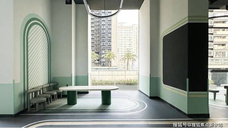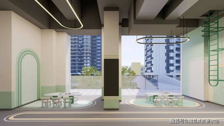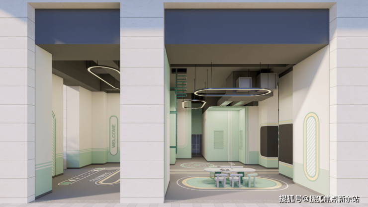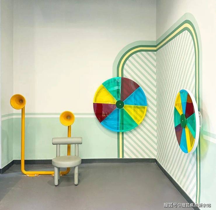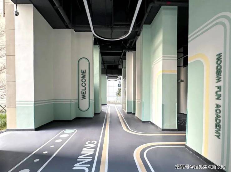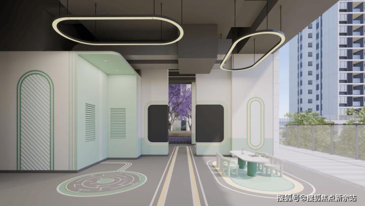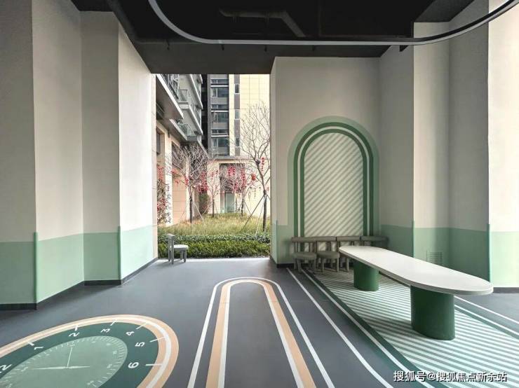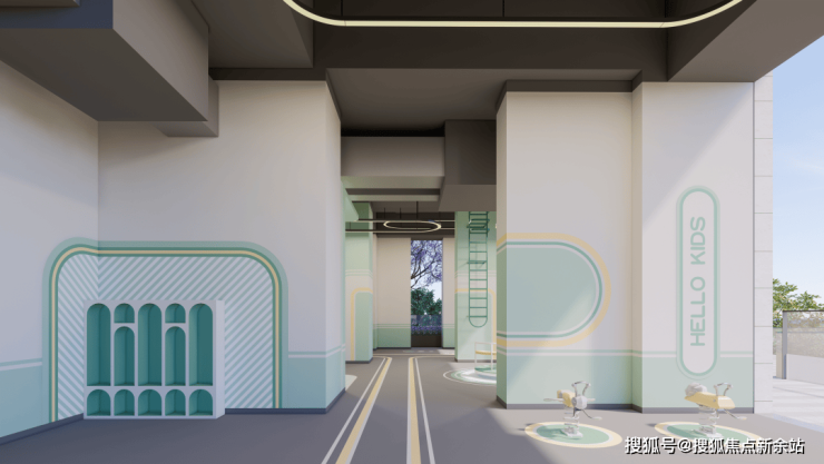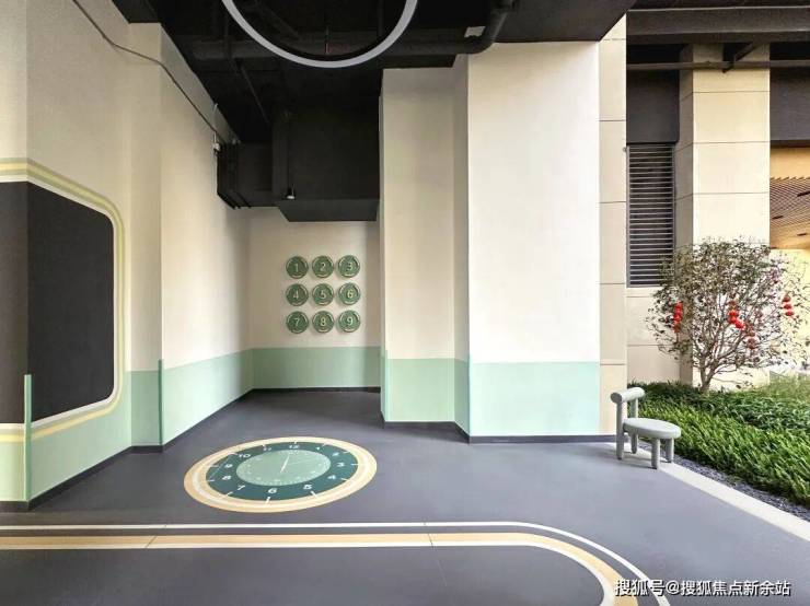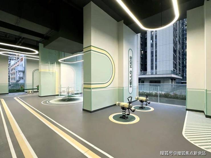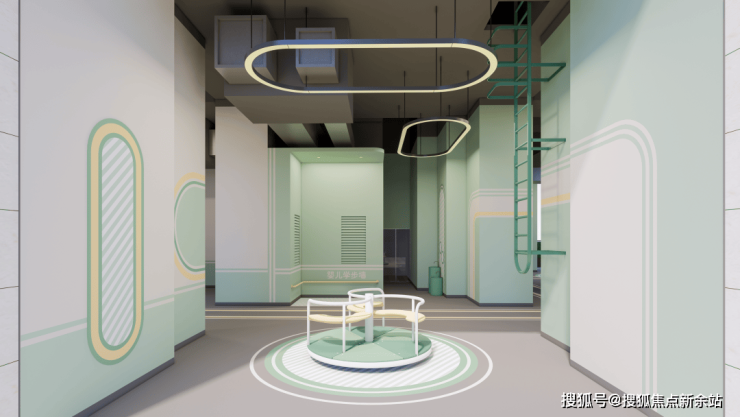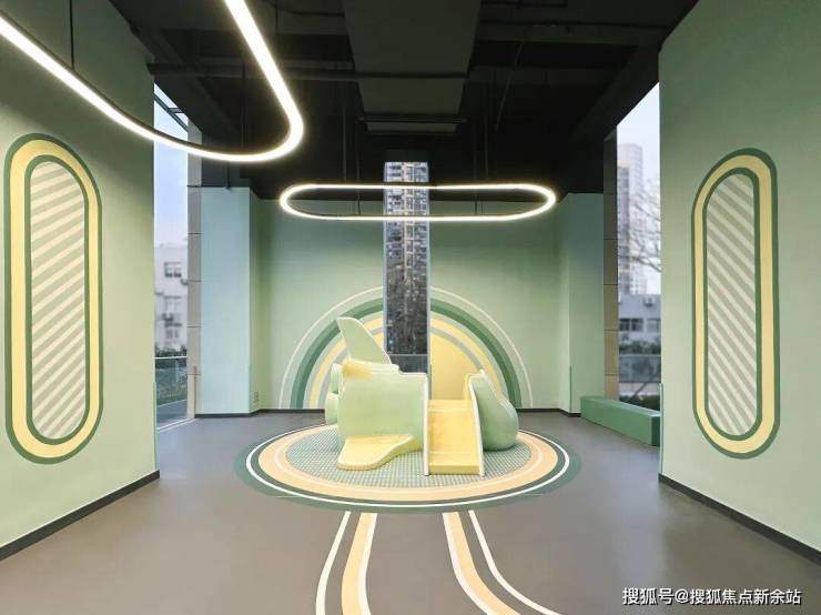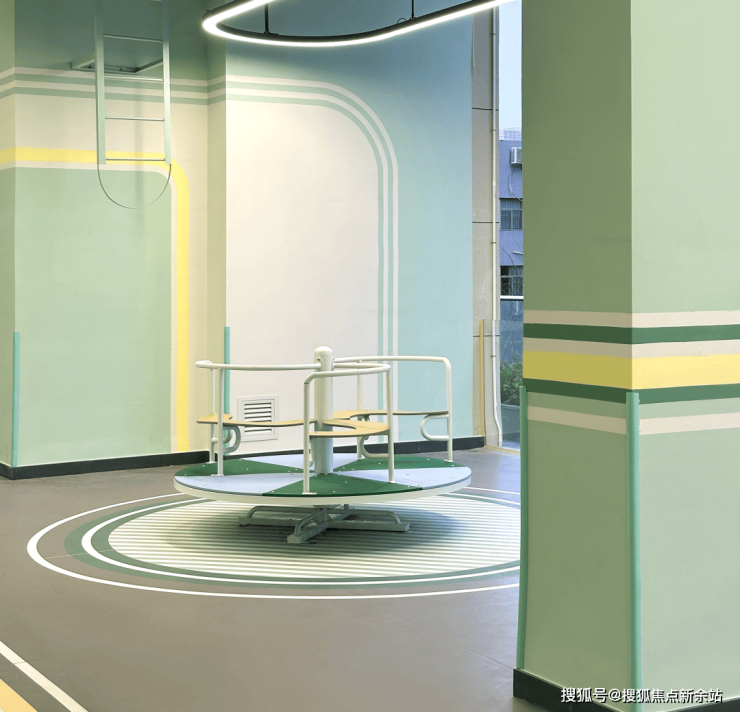 还有一个艺术与趣味融合的“童趣乐园”,薄荷绿墙面环抱投篮区,绿白轨迹引导童趣投射。复合游乐场设有学步区、弹簧木马与数字墙,让孩子感受艺术与趣味融合的创意氛围。飞机造型滑梯以明快薄荷黄交织色系,邀孩子滑行探索。童声穿透钢筋森林,笑声在此刻成自由生长的印记。