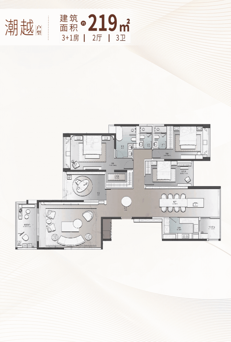 先来看看建面约219㎡户型,家庭欢聚无边界。