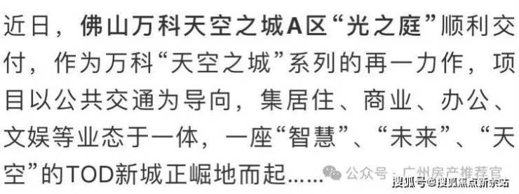 哈喽,欢迎来到广州房产推荐公众号了解佛山南海桂城三山新城《万科天空之城》当季红盘!国企物业!您值得拥有!