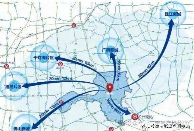 10分钟对接广州南站:佛山轨道2号线、南海新交通两条轨道直连广州南站,实现轨道交通零换乘;海怡大桥、番海大桥等跨江通道与南站片区路网无缝对接