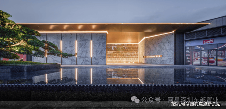 主入口依靠回龙河畔,在开敞式迎宾前广场设置跌水景观,结合名贵树种罗汉松,让尊崇出入道是寻常;超30m门庭设计,以仿古代照壁之手法,精选浪淘沙天然石材与古铜型材,尽显当代精奢雅致气质,演绎独属于东方门第的尊崇仪式。