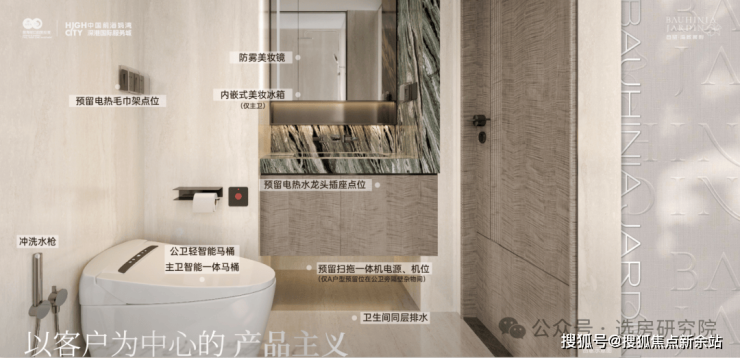 静音专项设计、线形地漏(淋浴间)、同层排水(洗手间)。