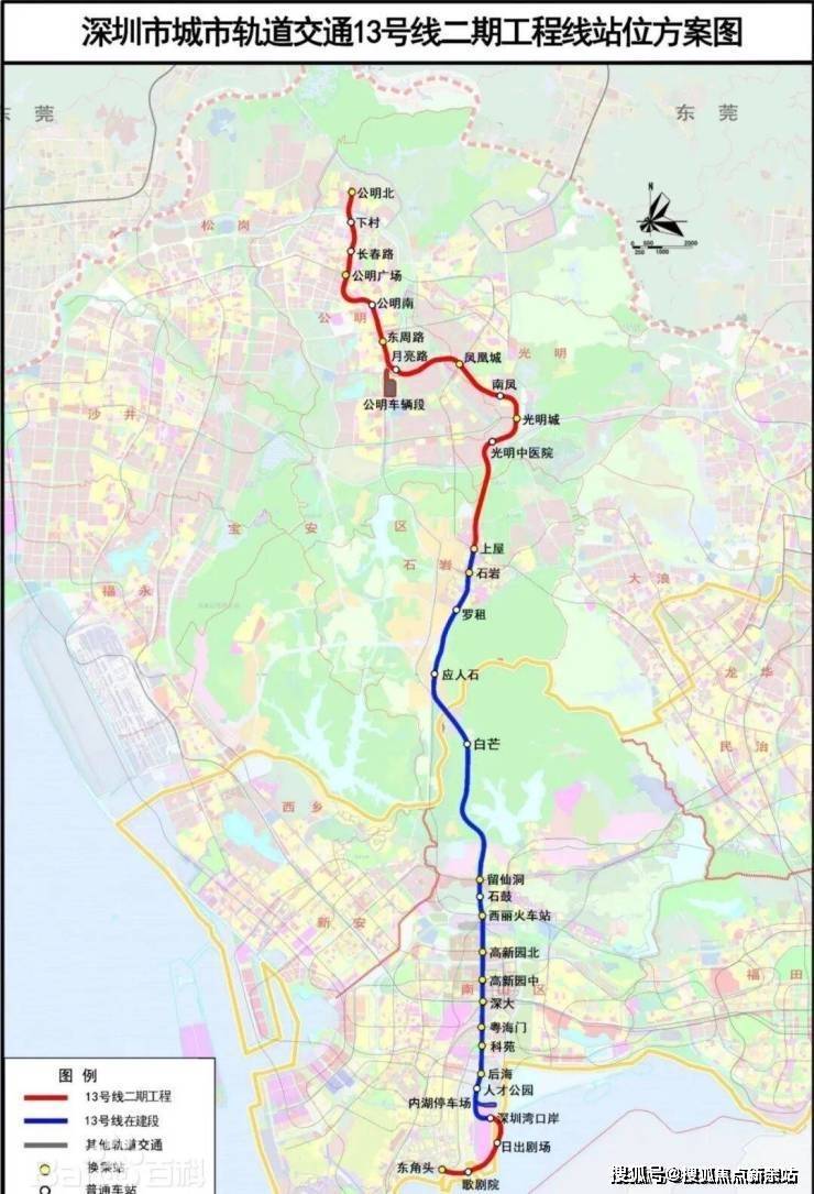 ①13号线及其南、北延长线(建设中,预计2025年开通)起于东角头站,终于公明北站,纵贯光明、宝安、南山,线路开通后约30分钟可抵达南山核心区,约45分钟可达深圳湾口岸,以高新技术人才为主要客流,被称为高新技术人才专线