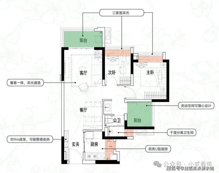 建面约84㎡3空间2厅2卫|得房率约93.5%