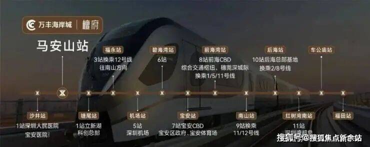 11 号线“马安山站”:D 出口直线距离约 300 米。作为深圳西部的快速轨道,11 号线(5 站)直达宝安机场、宝安中心(7 站)、前海湾(35 分钟)等核心区域,并与 1、2、3、5、6、7、9、12 号线等 8 条线路换乘,半小时可达南山科技园,50 分钟直达福田中心。