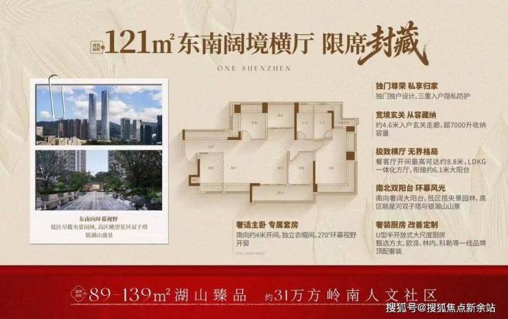 产品打造贴合刚需与改善需求,主力户型为81-139㎡精装3-4房,采用深圳新规设计,得房率高达90%-100%,户户朝南,多阳台多飘窗设计,空间利用率极高。社区打造岭南新中式园林,规划中央水景、儿童游乐区、健身步道等,同时配建12班制公办幼儿园,自带约3500㎡底商,满足业主日常需求。