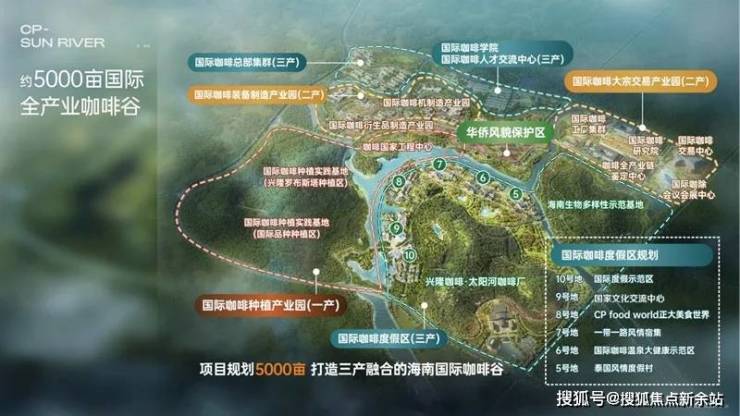 正大·太阳河咖啡小镇是由世界500强正大集团携手万宁市政府共同打造的以兴隆咖啡为基础、咖啡产业为核心、华侨情怀为动力、复兴民族咖啡为使命的中国咖啡三产融合标杆典范。项目建设约5000亩国际全产业咖啡谷,构建七大片区三产融合全产业链,规划“一产种植、二产加工生产、三产研发教育+会议会展+交易金融+仓储物流+文化节庆”。